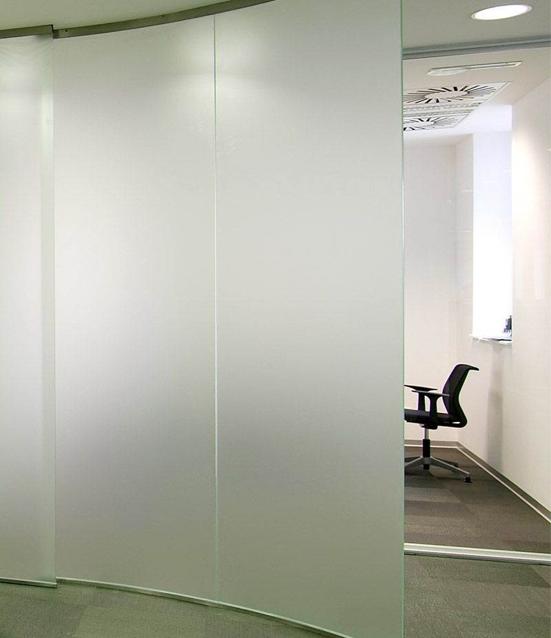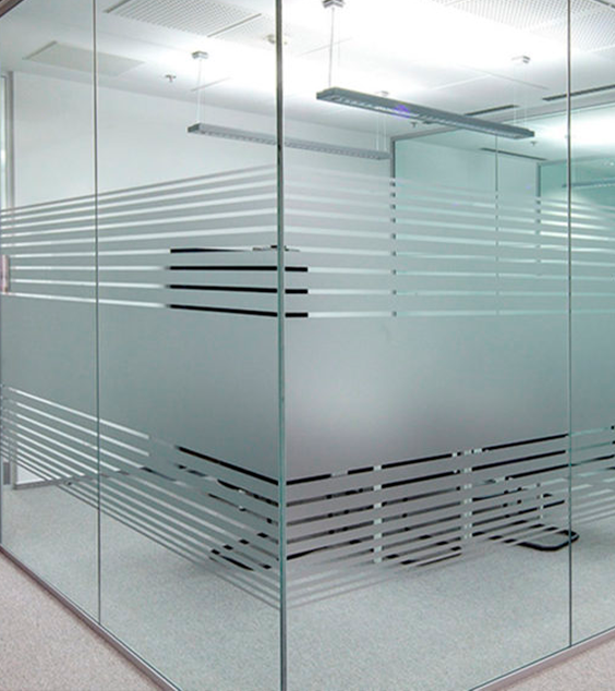Este acabado consiste en desbastar una delgada capa de la superficie del vidrio, el cual, es sometido a un abrasivo generando una superficie rugosa, opaca y traslucida.